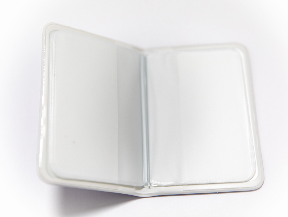 3"x4" card wallet with 10 slots that can fit debit cards, credit cards, etc.